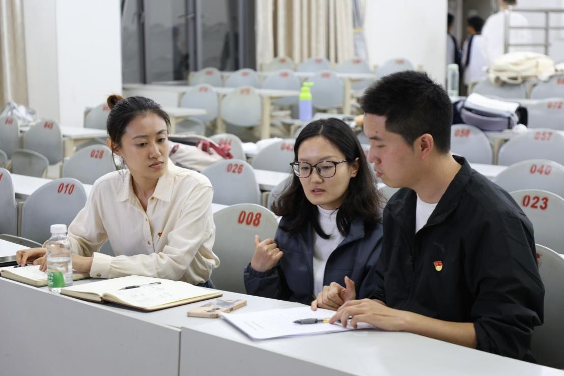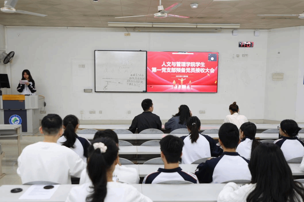12月8日下午,为加强基层党组织建设,增强党组织的凝聚力、战斗力,人文与管理学院学生第一党支部在教学楼D1-1召开预备党员接收大会。学生第一党支部书记揭志辉、支部成员徐烁同志与张琦涵同志、预备党员及党员发展对象出席会议。
