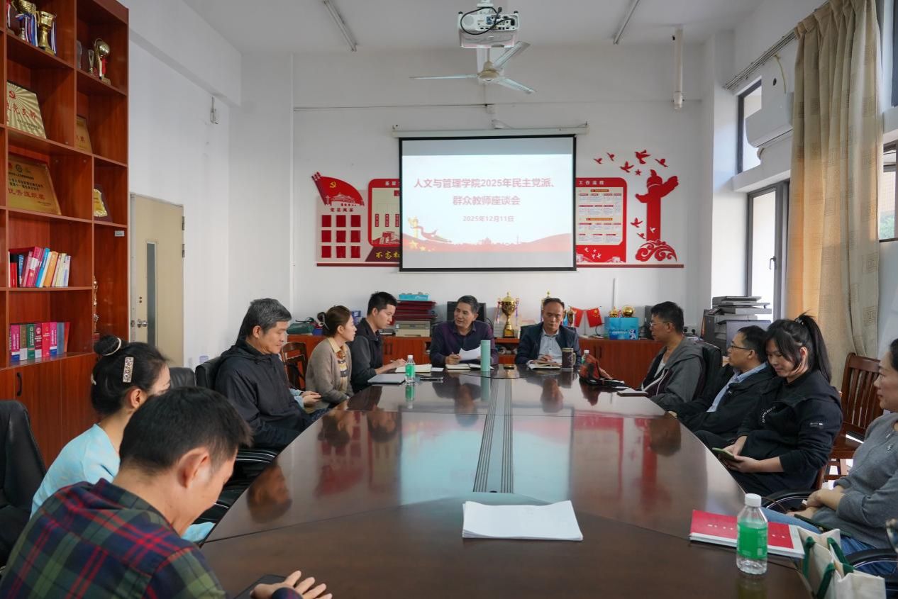 12月11日下午,人文与管理学院在会议室召开2025年民主党派、群众教师座谈会。学院党委书记陈明主持会议,院长黄祖辉出席会议,学院民主党派、群众教师代表共同参会。