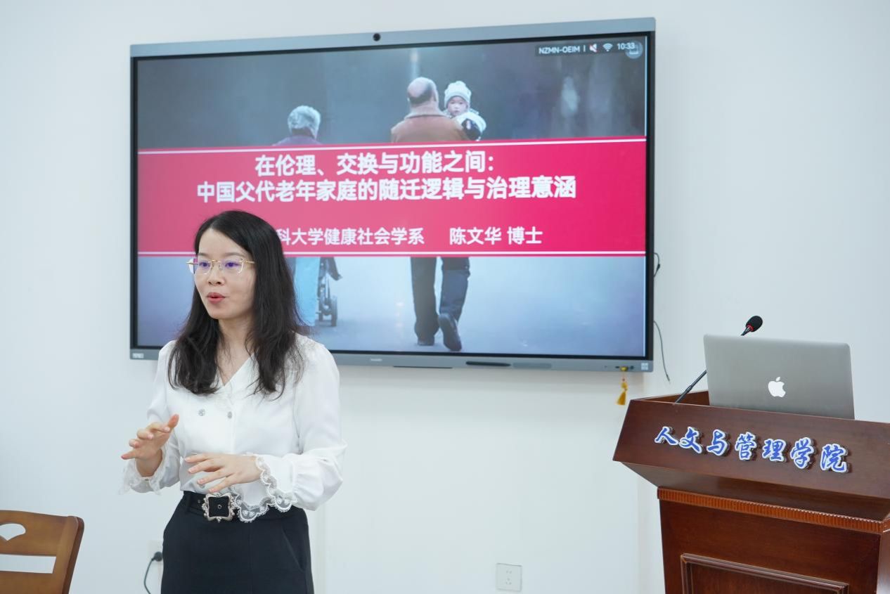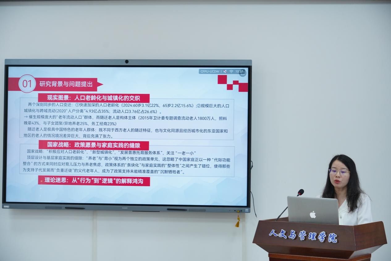 秋意渐浓,学术正暖。10月17日上午,广东医科大学人文与管理学院第14期青年学者学术沙龙在学院219会议室如期举行。健康社会学系陈文华博士以“在伦理、交换与功能之间:中国父代老年家庭的随迁逻辑与治理意涵”为题作报告,谭健峰副院长、万崇华教授及健康社会学系多位教师齐聚一堂,共话老龄化社会的家庭变迁与治理之道。